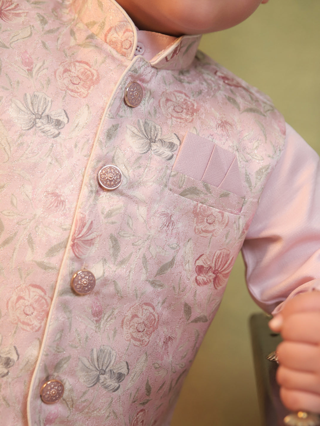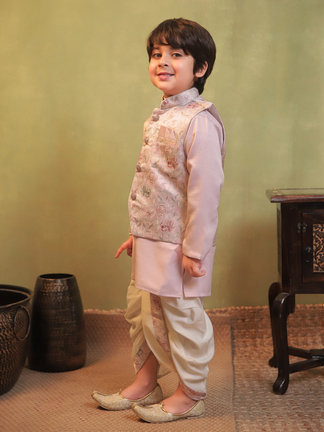 Stylish 3-piece Pink cotton dhoti set for boys by AJ Dezines. Includes solid kurta, floral printed waistcoat & dhoti. Soft, breathable, and perfect for festive or traditional occasions.