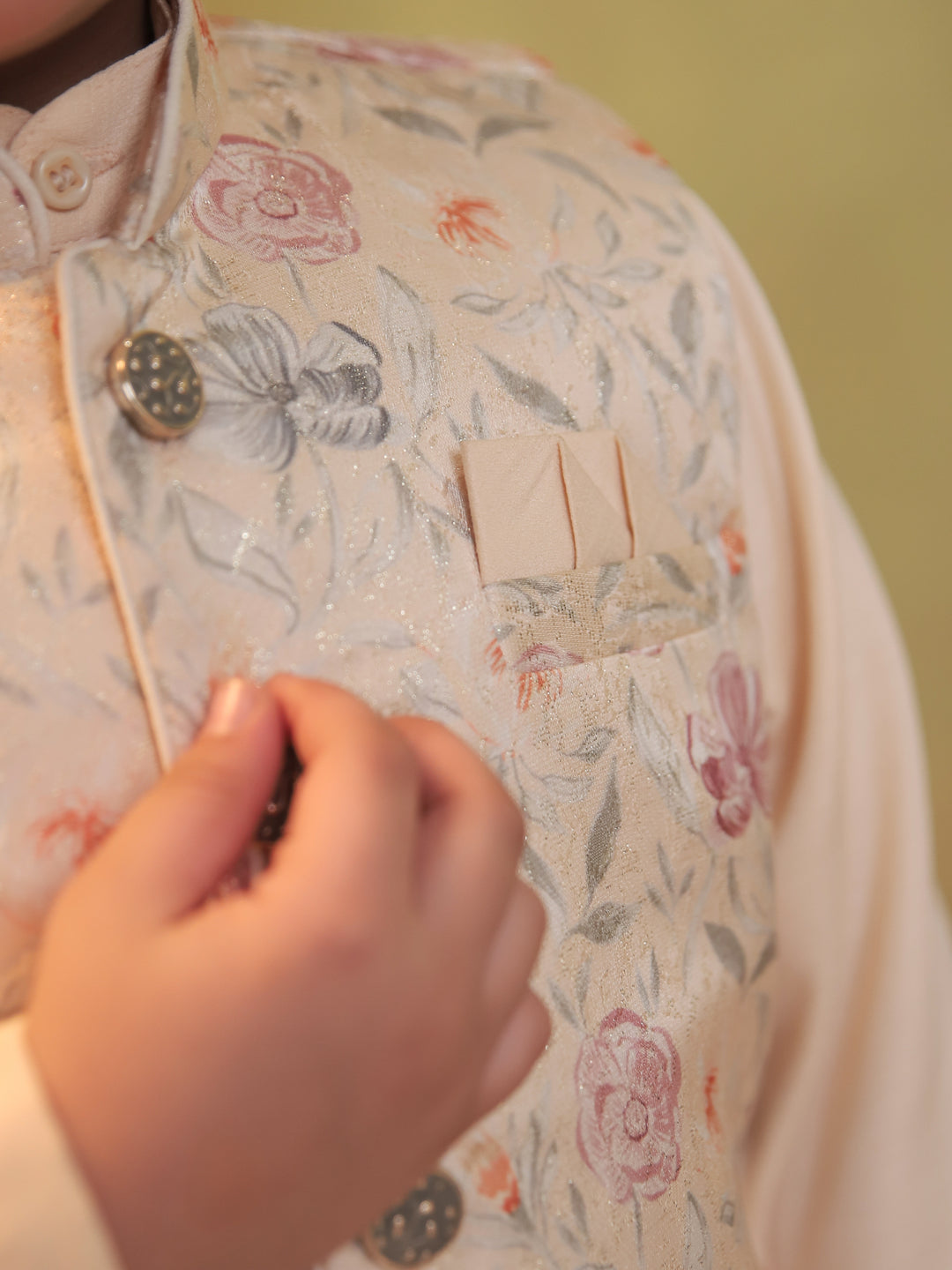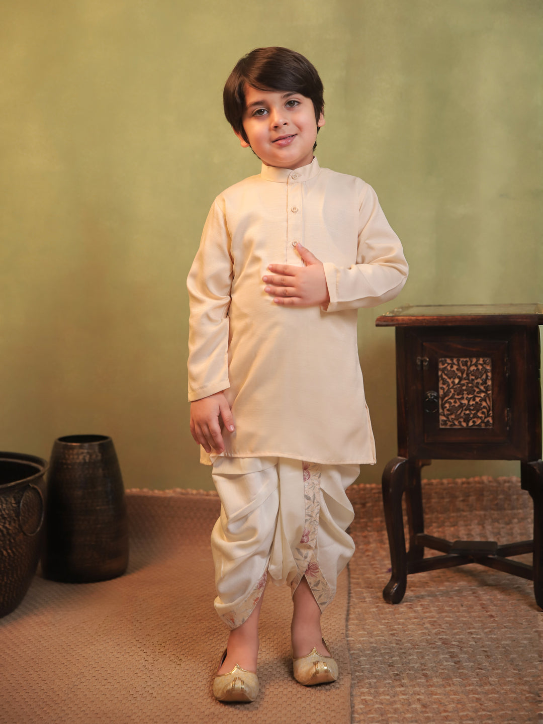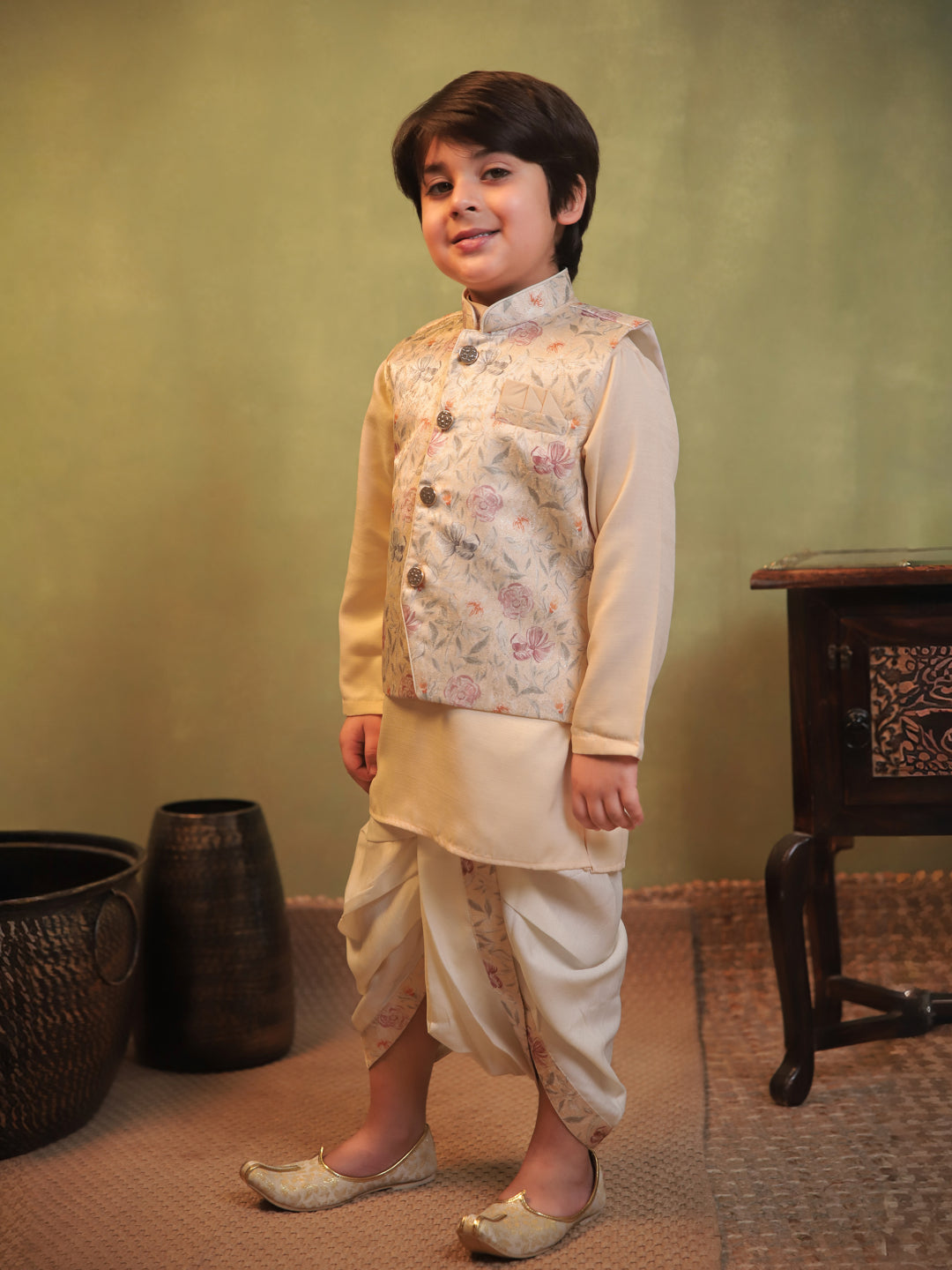Stylish 3-piece Yellow cotton dhoti set for boys by AJ Dezines. Includes solid kurta, floral printed waistcoat & dhoti. Soft, breathable, and perfect for festive or traditional occasions.