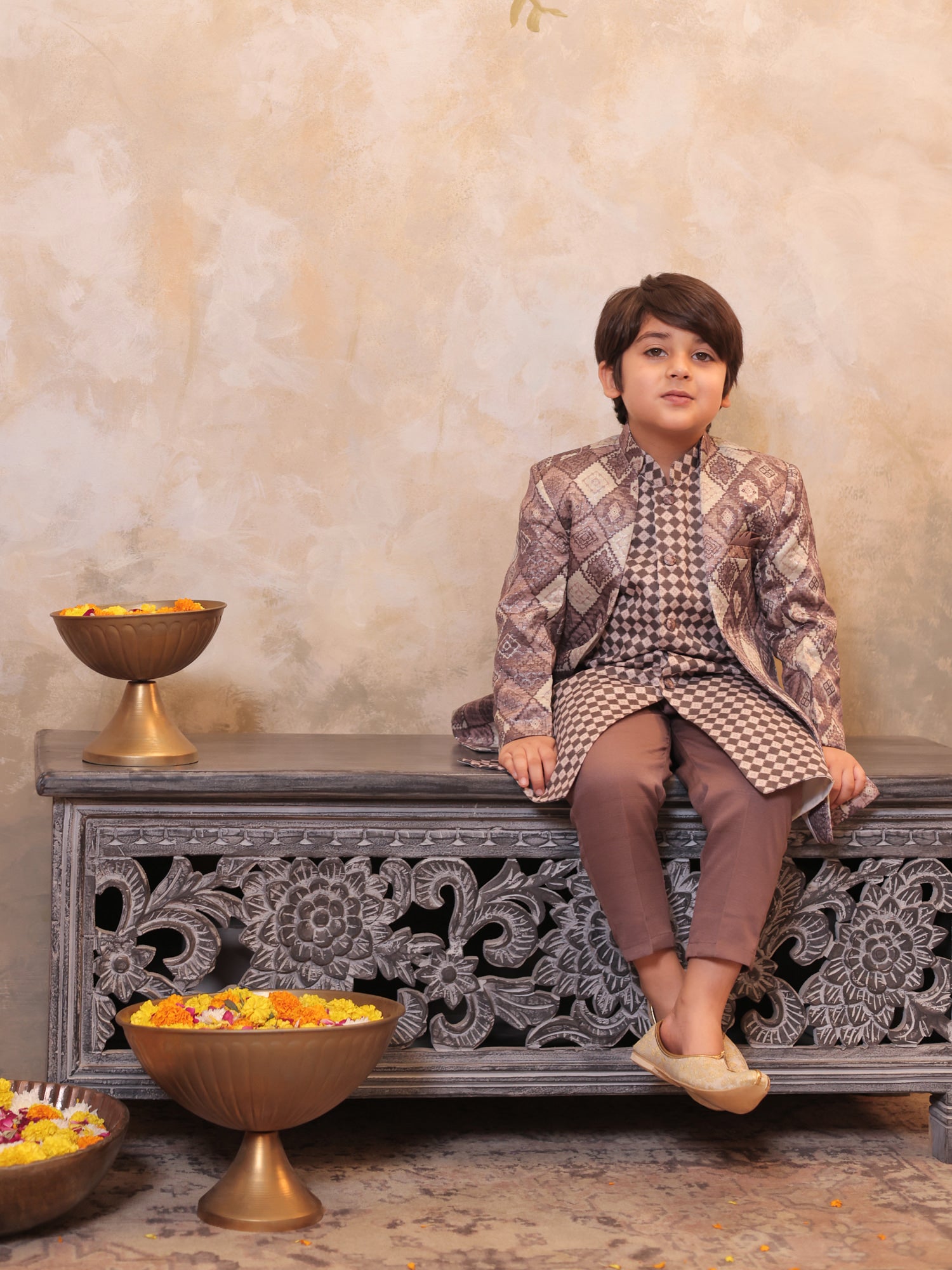 AJ Dezines Mauve Jacquard Sherwani for Boys – Elegant full-sleeves sherwani in rich Embroidery jacquard fabric with mandarin collar and soft lining. Perfect for weddings, parties, and festive occasions.