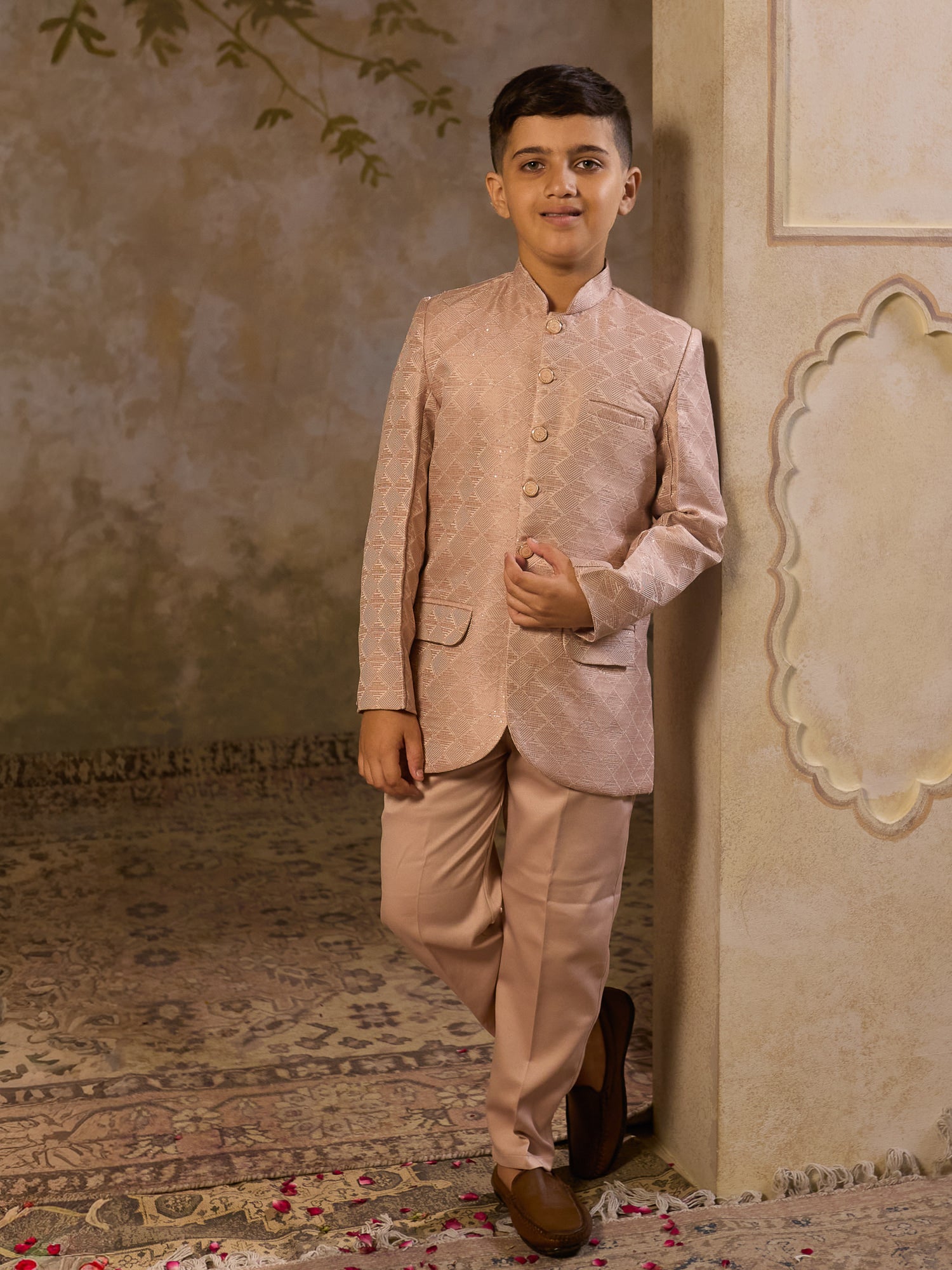 AJ Dezines Peach Jacquard Sherwani with full sleeves, sequins & embroidery work. Perfect festive wear for boys, offering royal style with comfort for weddings & celebrations.