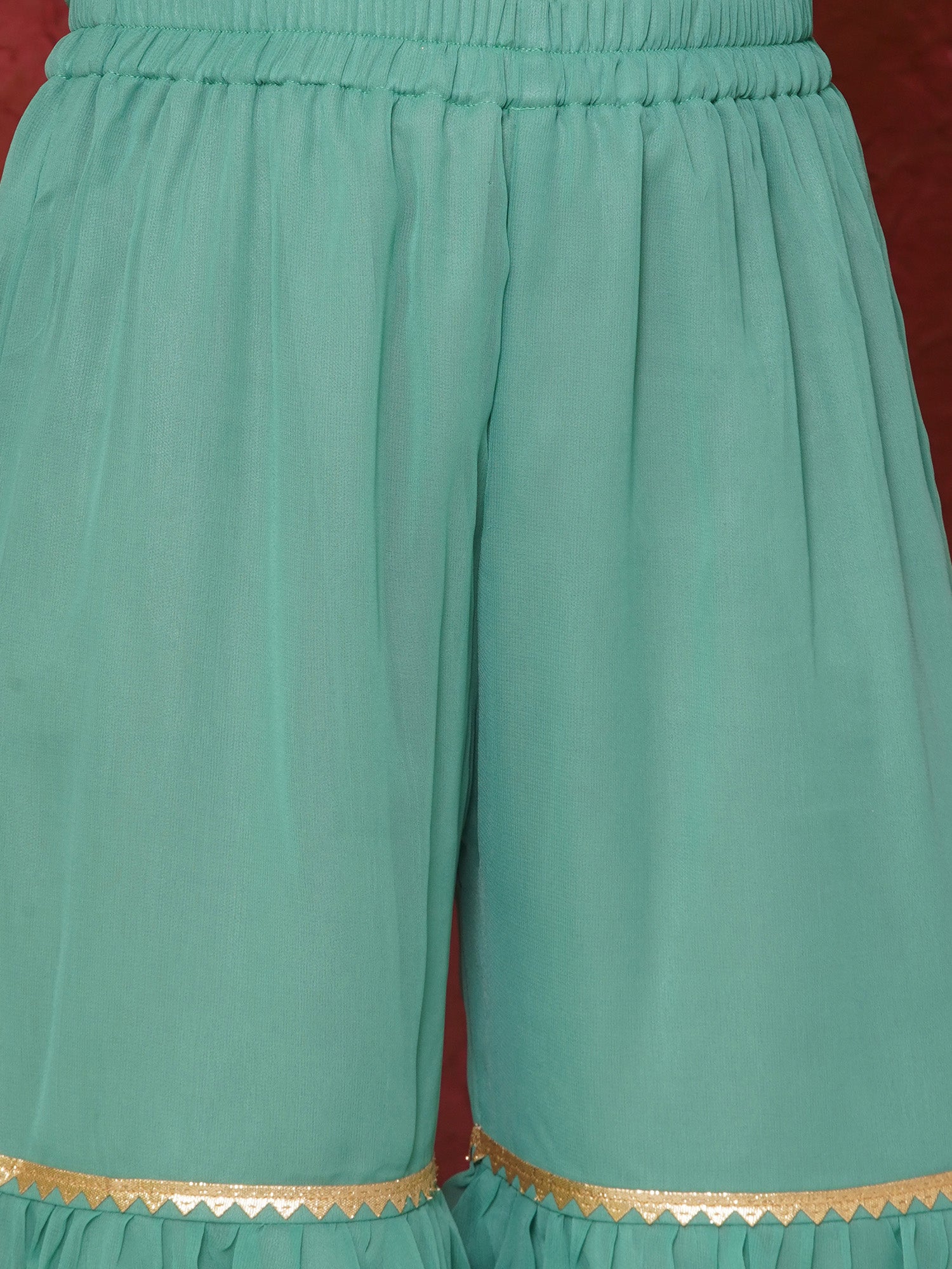 Green Georgette Three-Fourth Sleeves Motif Print Sharara Set For Girls