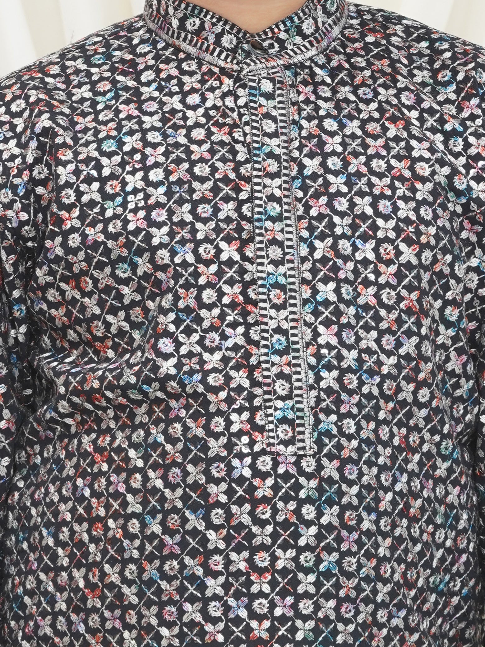 Aj Dezines Grey Cotton Blend Full Sleeves Sequenced Kurta for Boys combines comfort and style, featuring a breathable fabric, full sleeves, and sequenced detailing, perfect for festive occasions.