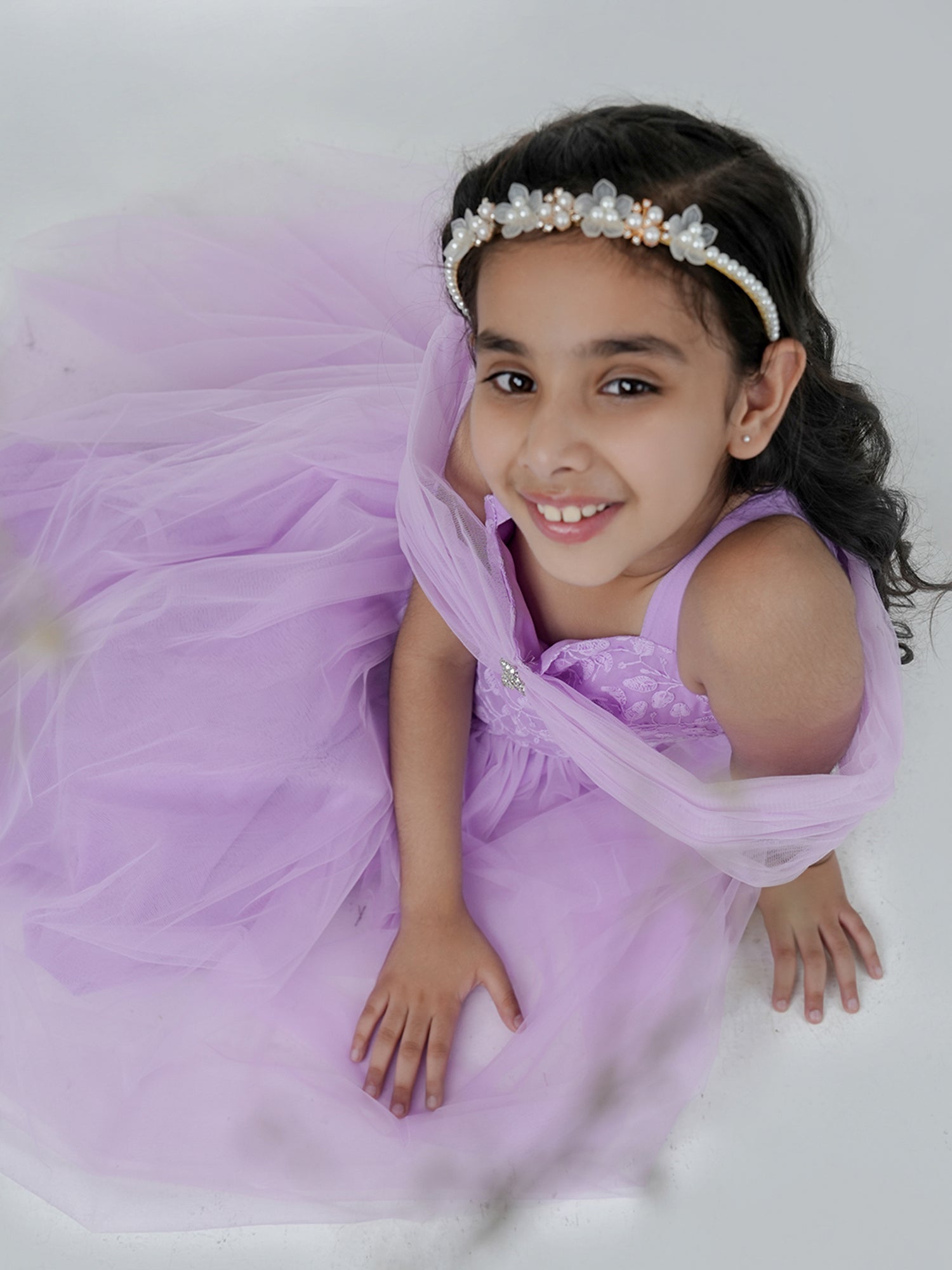 Aj Dezines Lavender net sleeveless gown with embroidery and brooch. Soft lining, flared fit, and elegant style—perfect for birthdays, weddings, and festive occasions.