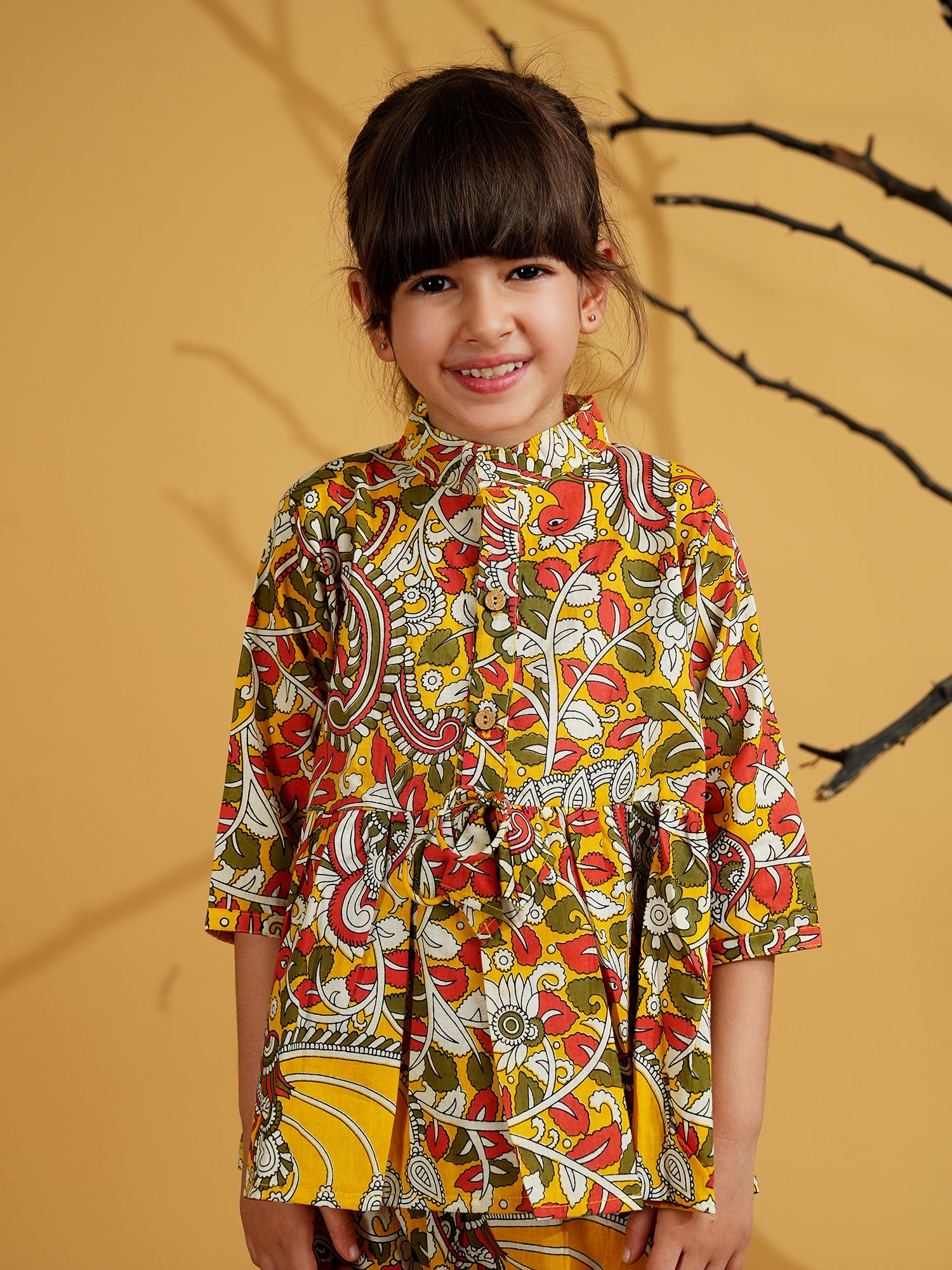 AJ Dezines multi-color co-ords for girls with a mustard base, floral print, and 3/4th sleeves. Made from soft cotton—perfect for summer days, outings, and everyday comfort with style.
