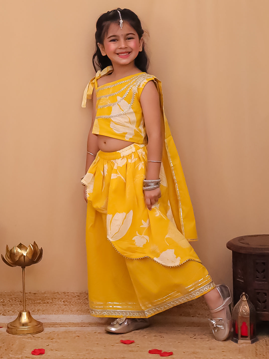 Bright and breezy Pink cotton lehenga choli with floral print. Sleeveless design, comfy fit, and matching dupatta – perfect for festive occasions and celebrations.