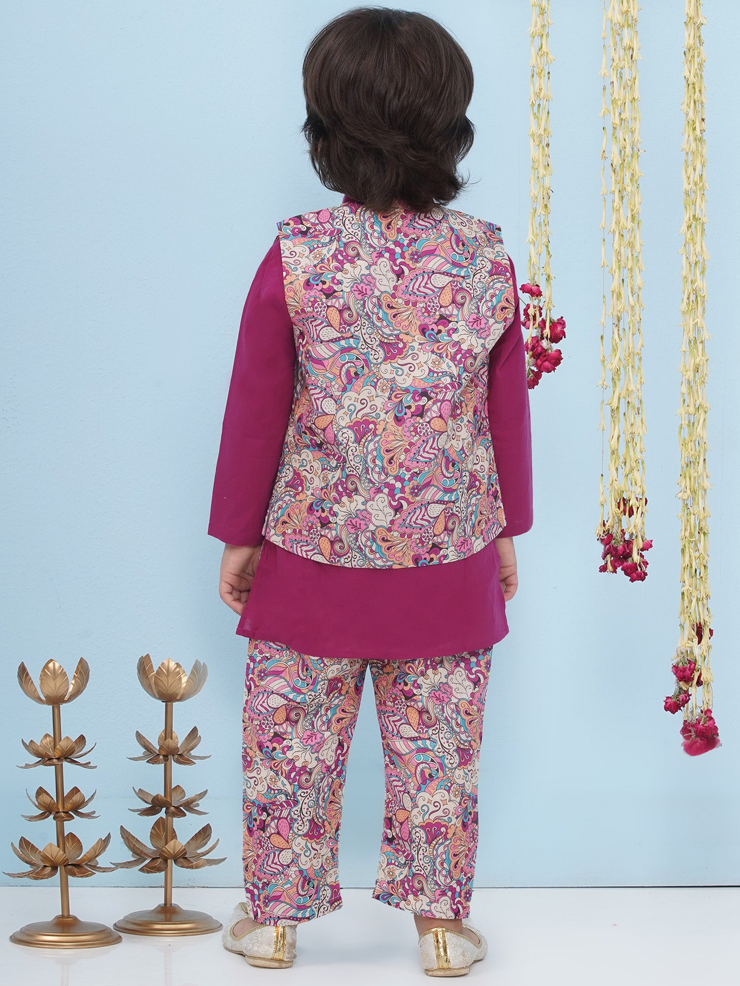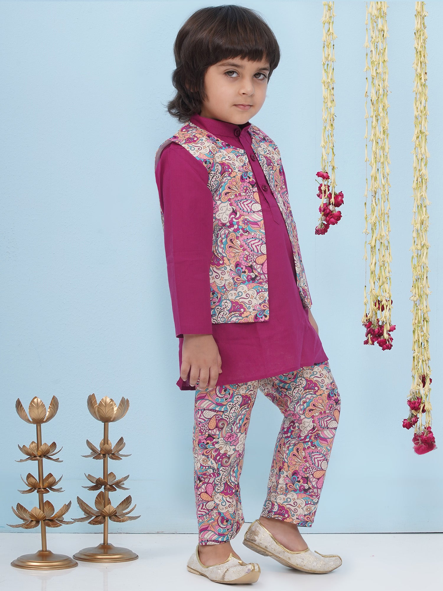 Aj Dezines Purple Cotton Full Sleeves Floral Printed Kurta Pyjama With Waist Coat For Boys