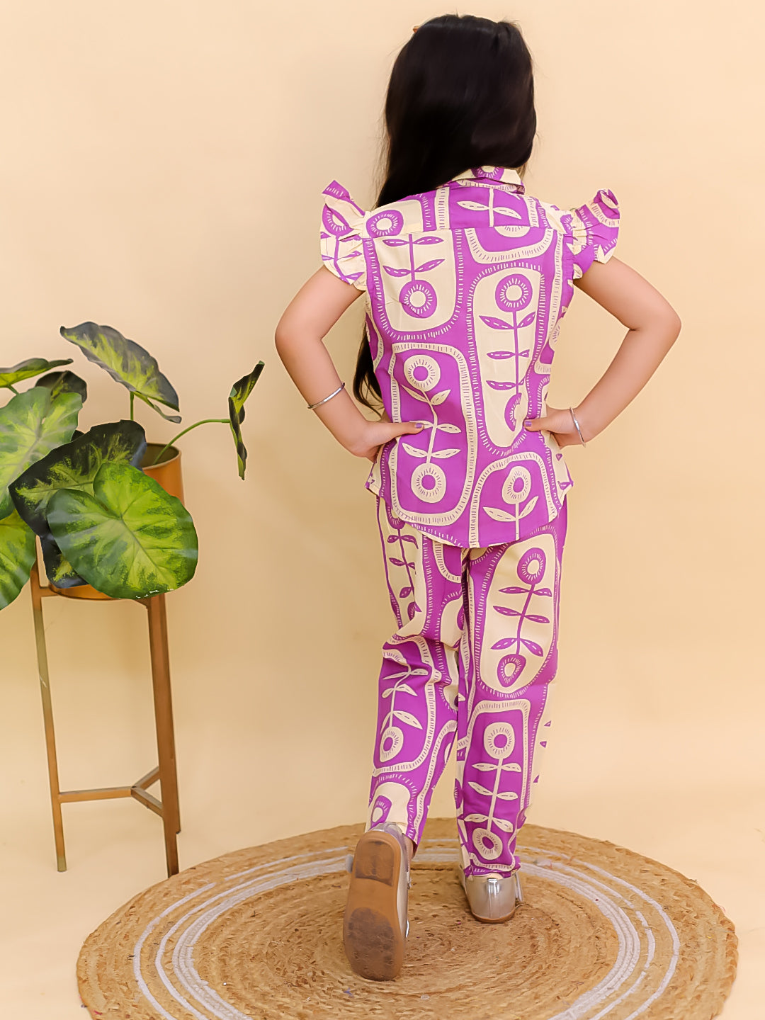 AJ Dezines Purple Cotton Co-Ords for girls features a sleeveless top with big floral print and matching bottom. Soft, breathable, and stylish—perfect for outings, playdates, and summer days.