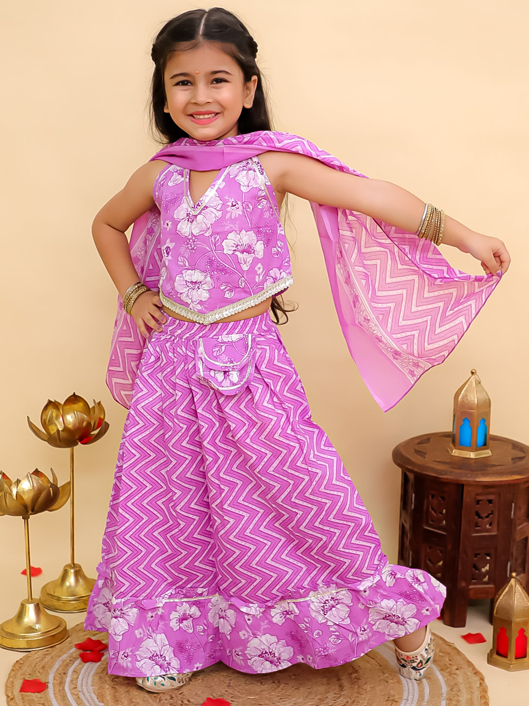 Aj Dezines Purple Cotton Sleeveless Floral Printed Lehenga Choli for Girls