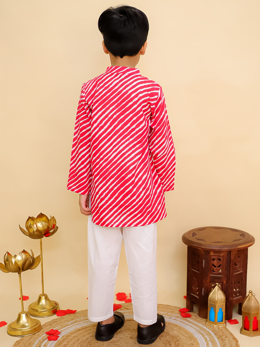 AJ Dezines Red Cotton Kurta Pyjama Set features a vibrant leheriya print and full sleeves. Paired with a white pyjama, it's perfect for festive occasions and ensures all-day comfort.