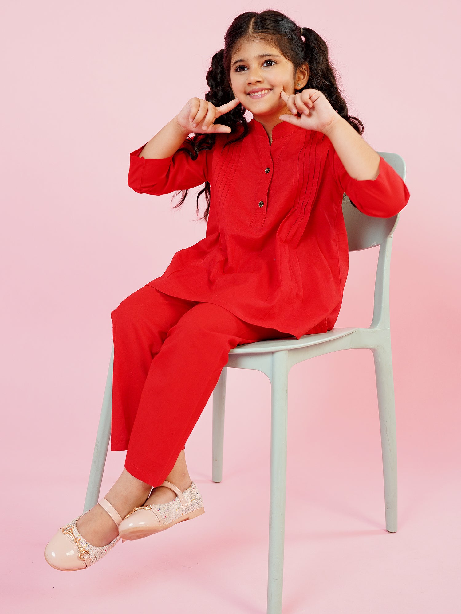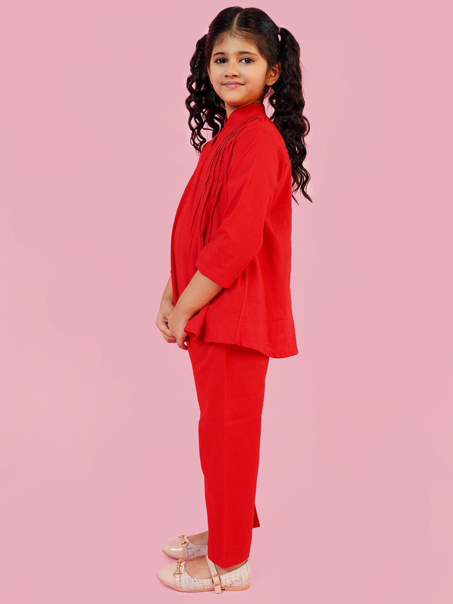 AJ Dezines Red Pure Cotton 3-4th Sleeves Solid Girls Co-Ords