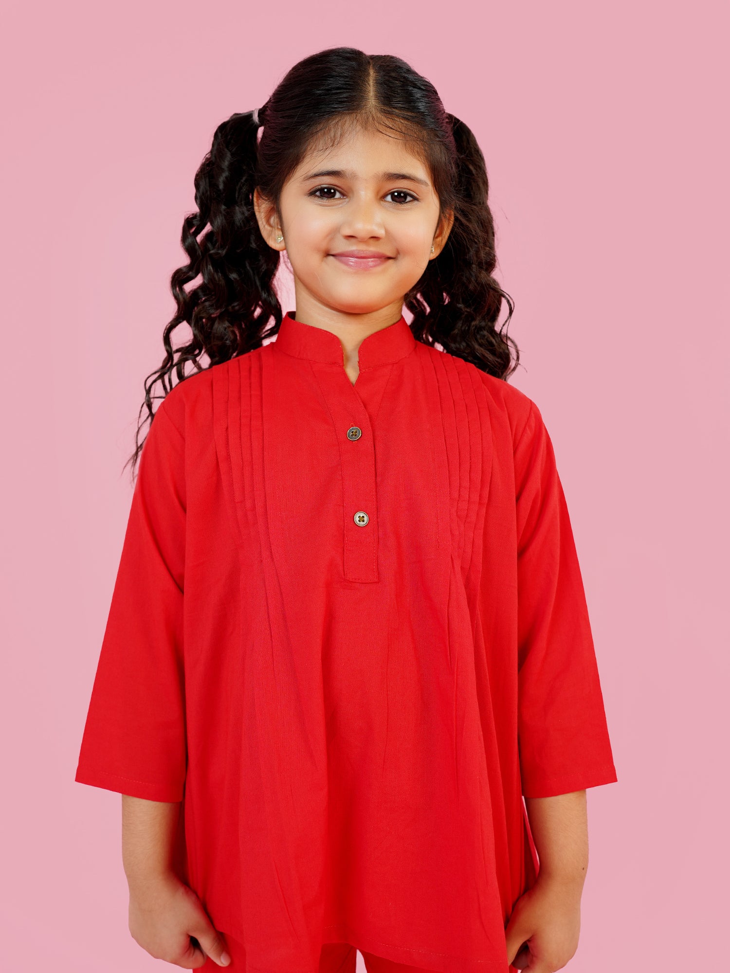 Aj Dezines Red Pure Cotton Kurti and Pant Co-Ords for Girls: Soft, breathable fabric with 3-4th sleeves and a stylish design. Ideal for casual or festive wear. Easy care and comfortable fit.
