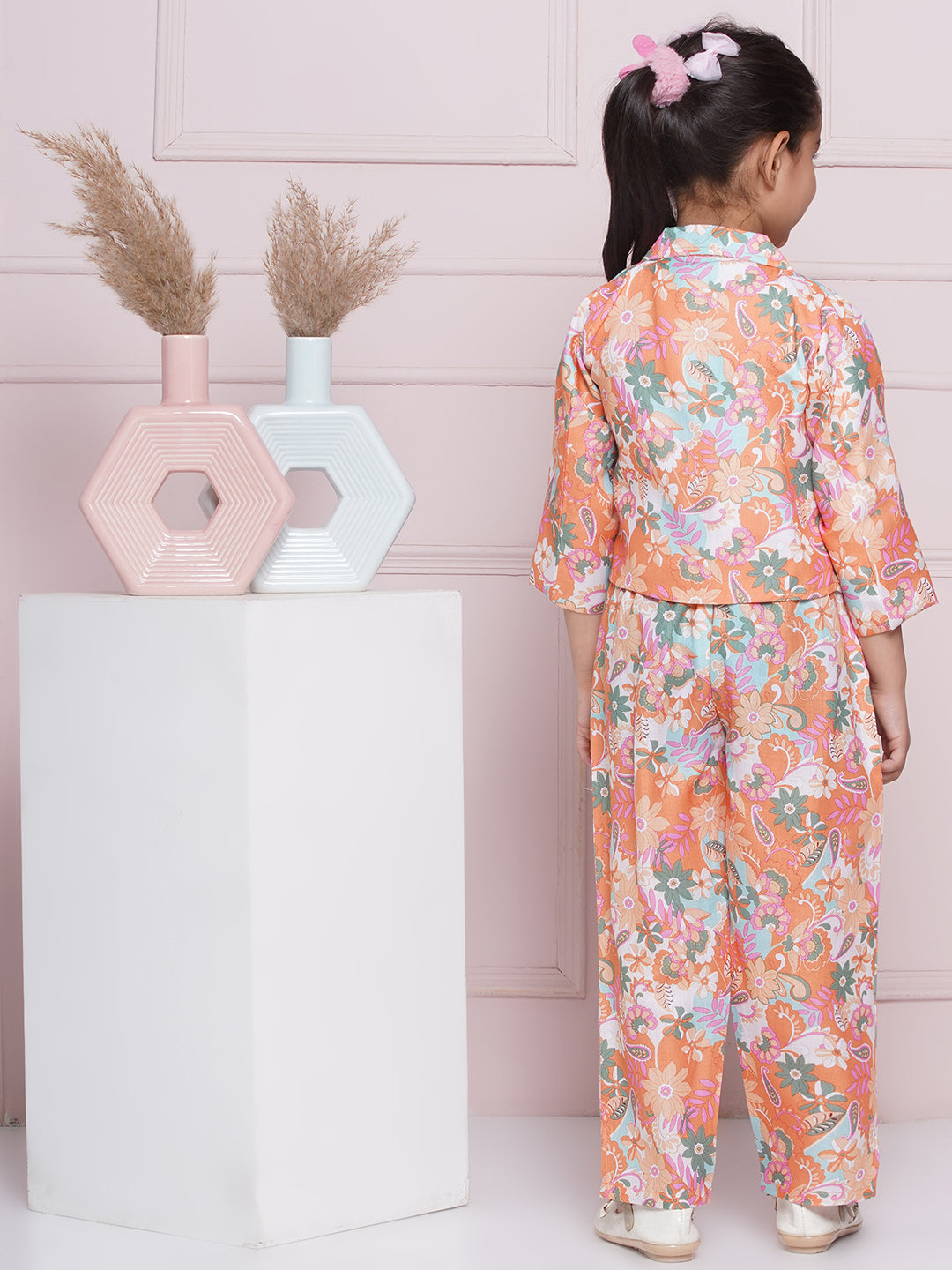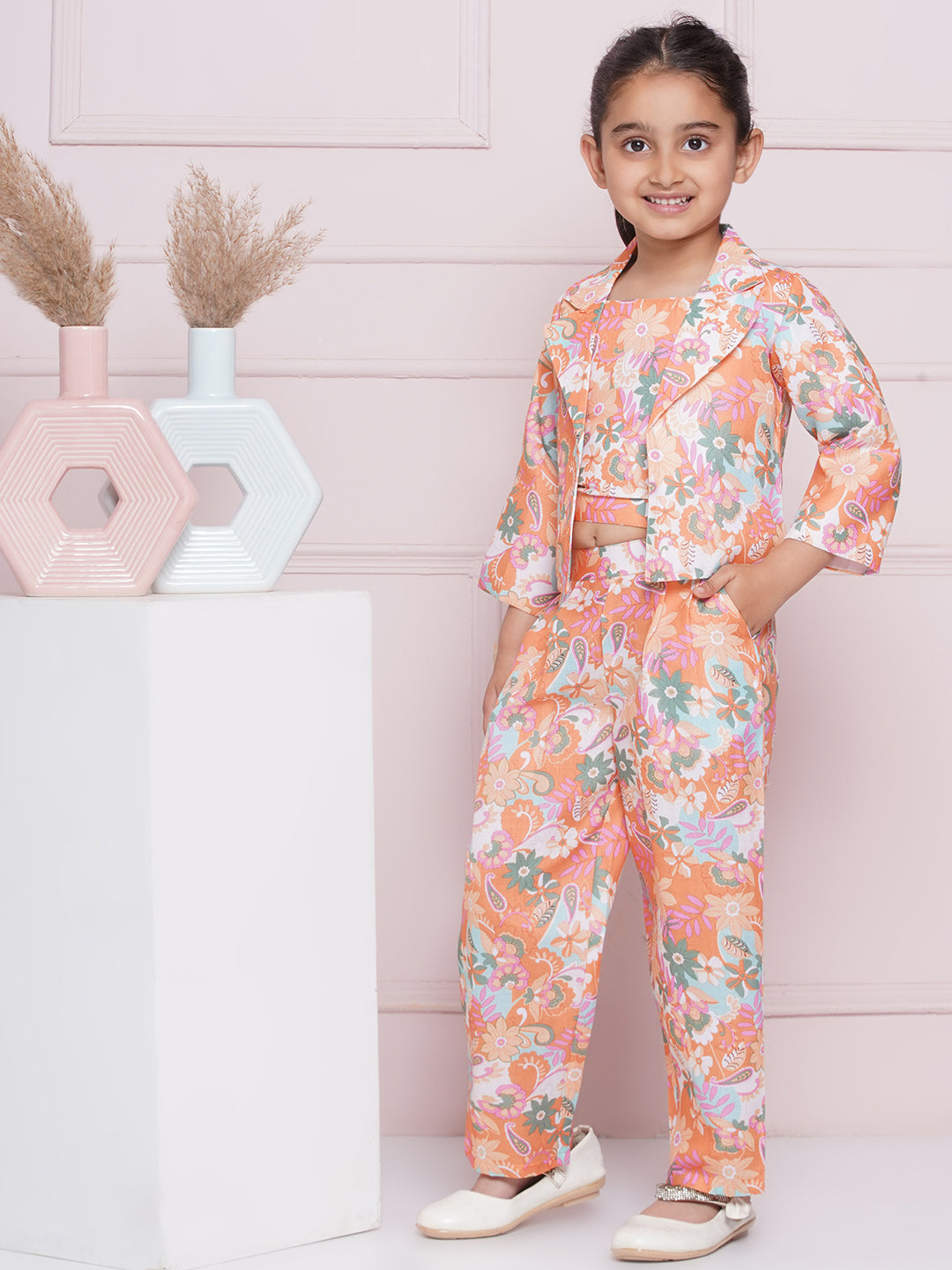 The AJ Dezines Three Fourth Sleeve Orange Printed Cotton Top, Pant, and Jacket for Girls is a cheerful outfit designed to add a pop of energy to your daughter's wardrobe. Crafted from soft cotton fabric, this ensemble includes a top with a three-fourth sleeve design, featuring an eye-catching orange print. The half pant and matching jacket provide a comfortable fit and style for various casual occasions. This AJ Dezines set encourages your daughter to express her unique personality while staying fashionable and comfortable.
