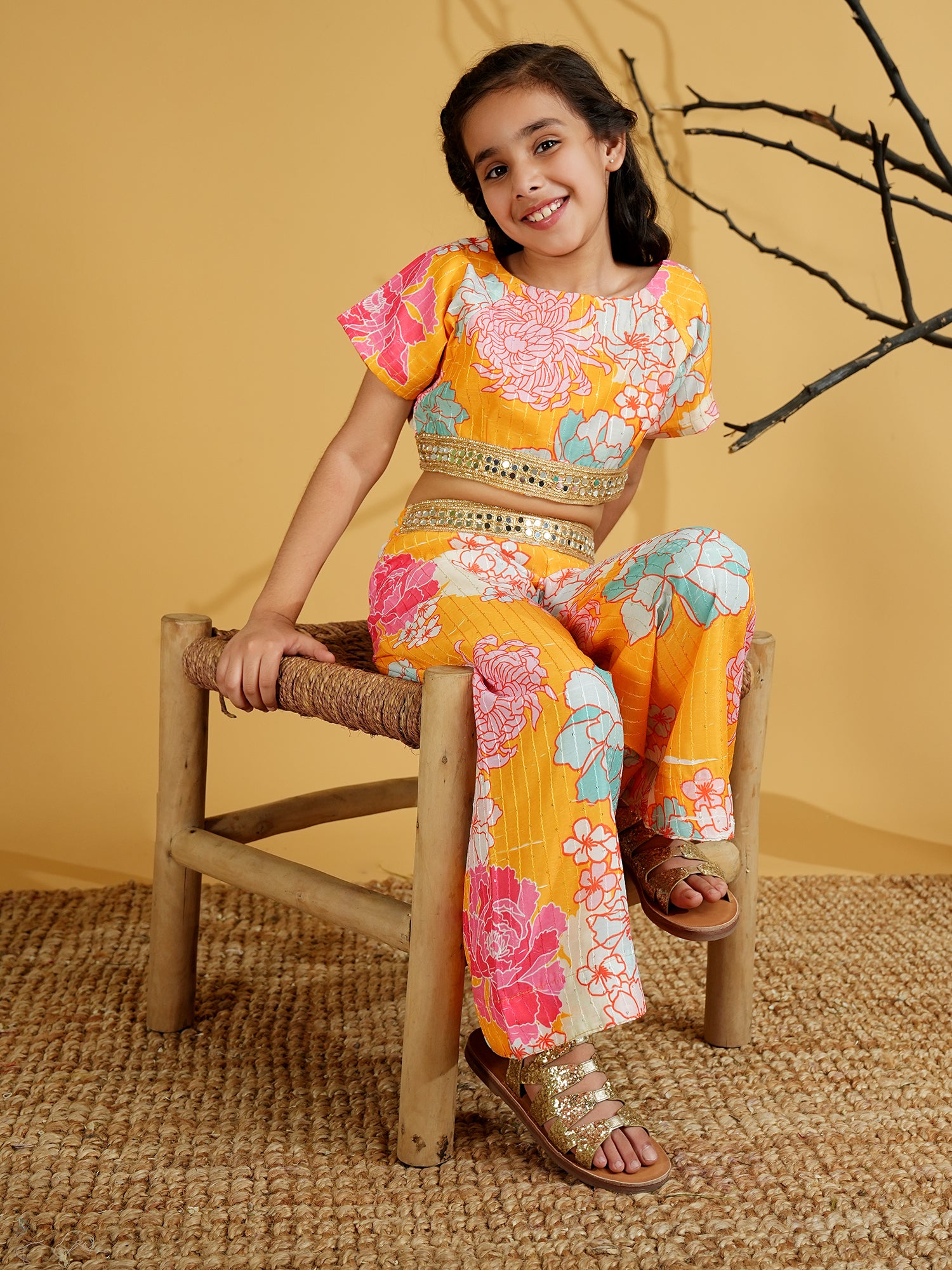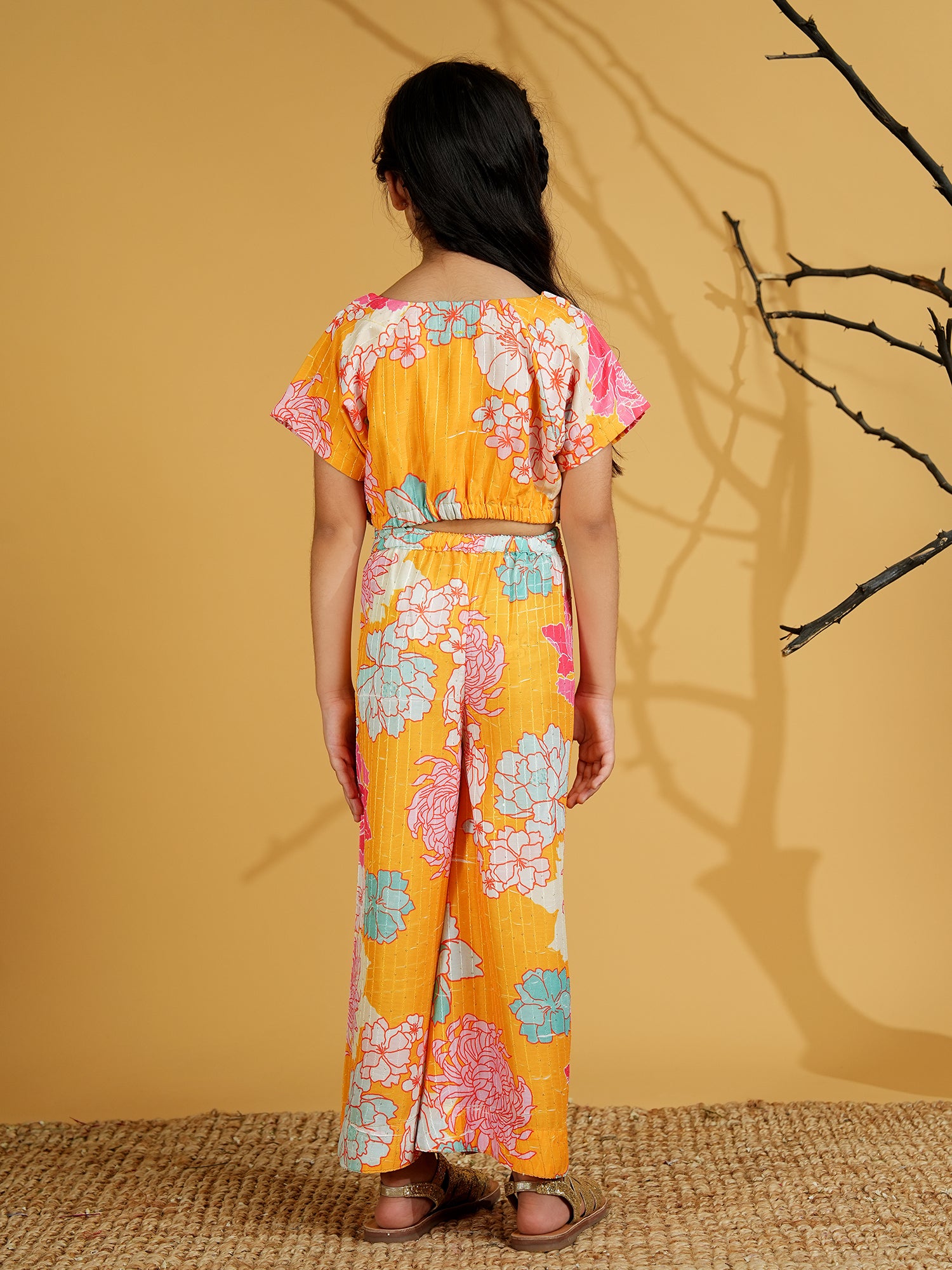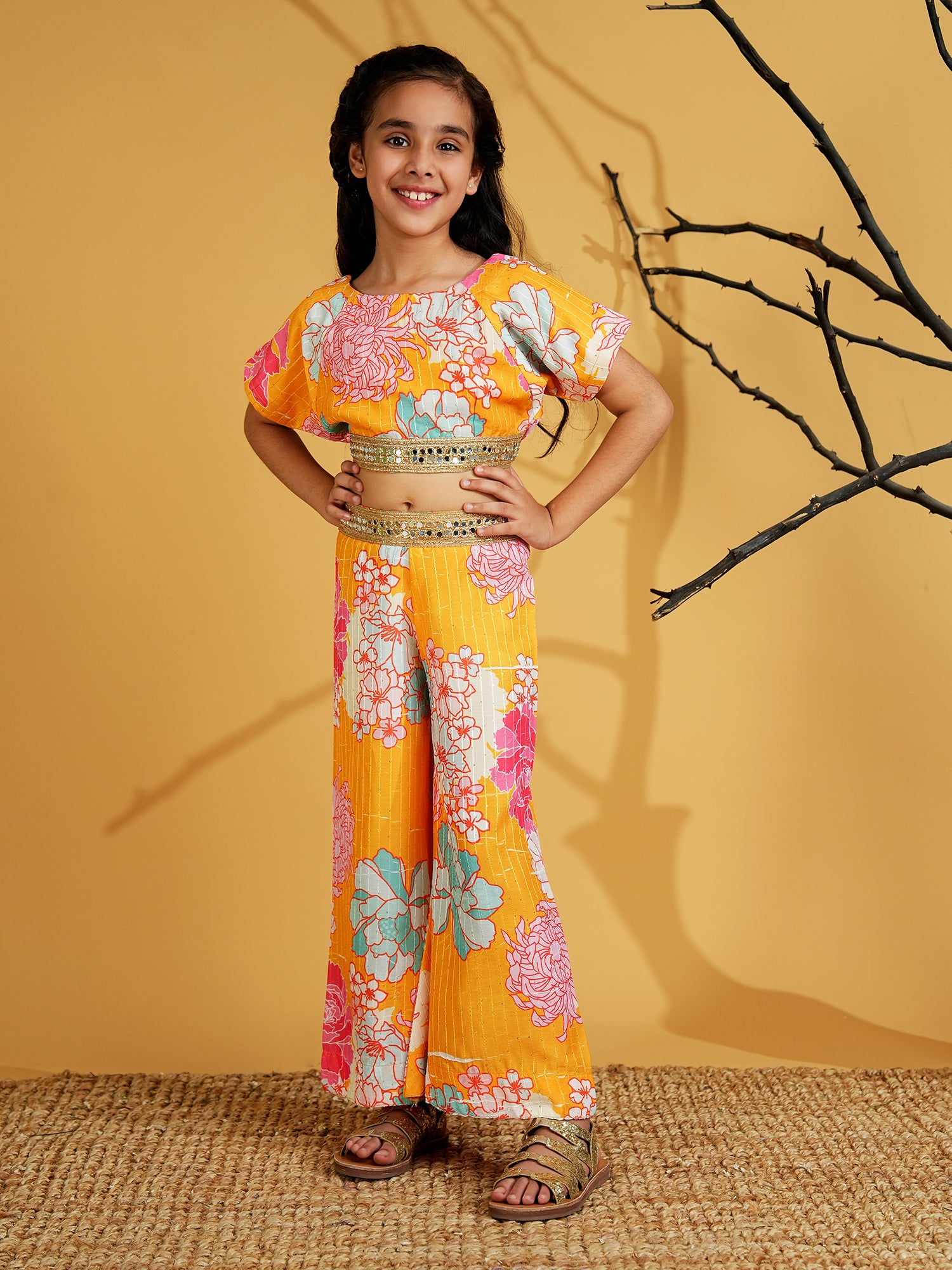 AJ Dezines Yellow Cotton Blend Half Sleeves Printed Girls Co-Ords with Lace work