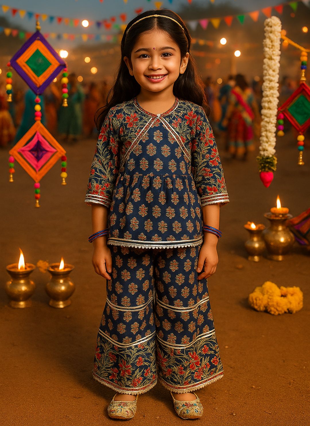 Celebrate Navratri in style with AJ Dezines Blue Cotton Girls Co-Ords, featuring a floral print peplum top and matching wide-leg bottoms. Comfortable, festive, and perfect for Garba nights!