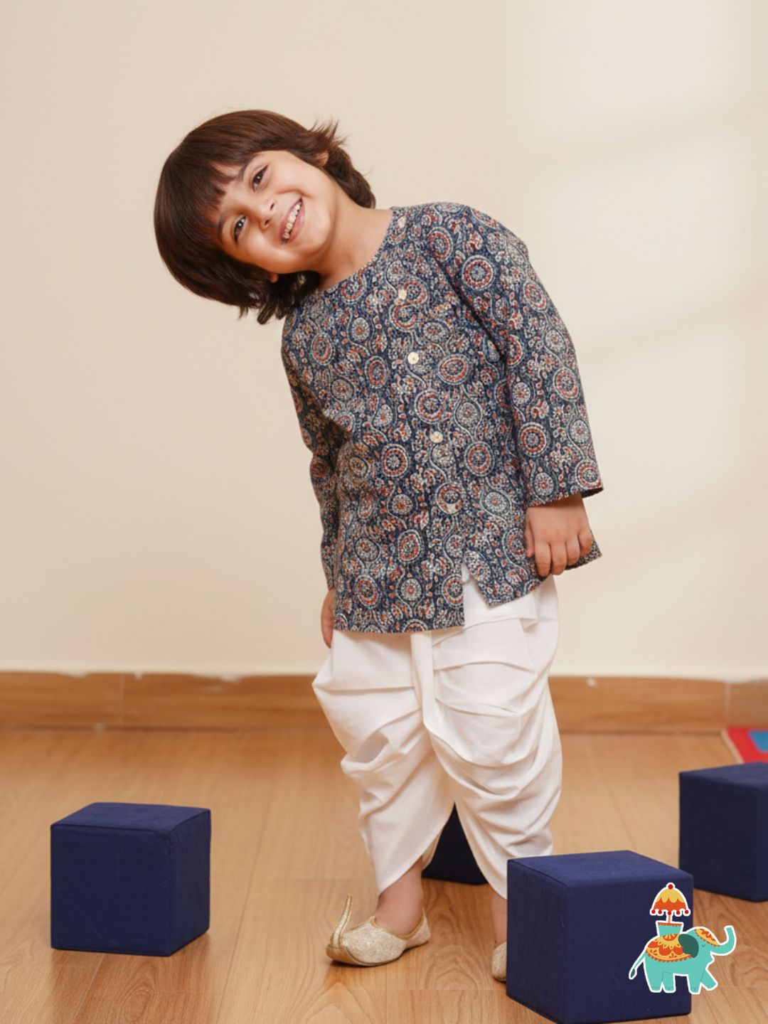 Aj Dezines BLUE Pure Cotton Full Sleeves Abstract Print Dhoti Set for Boys: Stylish full sleeves kurta with abstract print, paired with comfortable dhoti, ideal for cultural events and festive occasions.