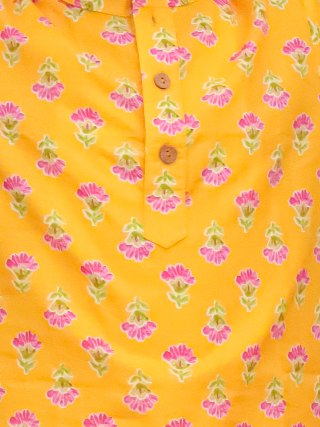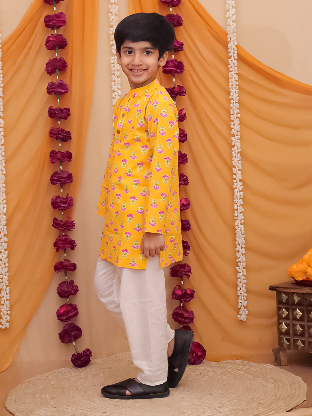 Boys Yellow Cotton Full sleeves Floral Print Kurta Pyjama Set