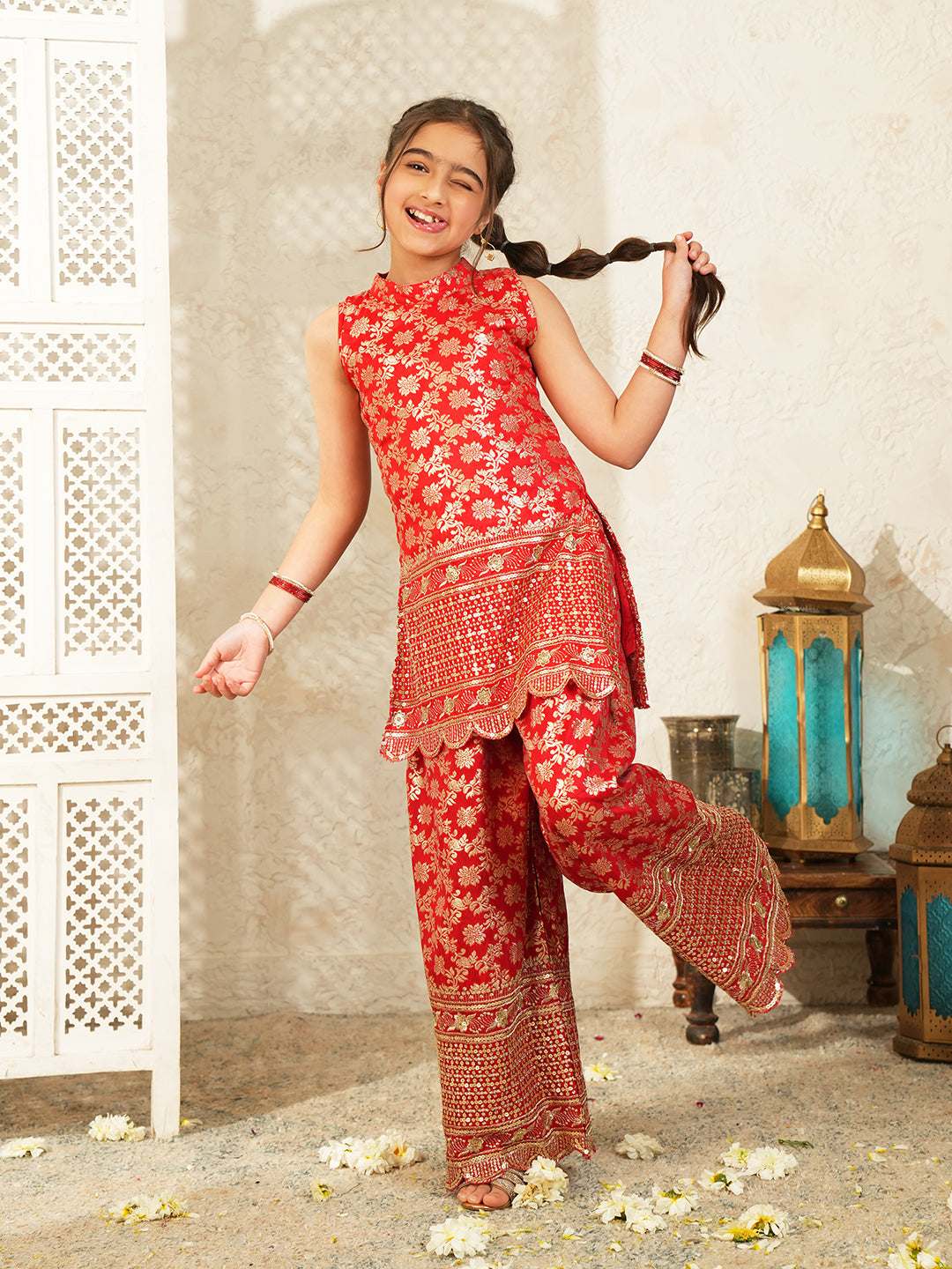 Red Heavy Embroidered Brocade Kurti and Palazzo For Girls