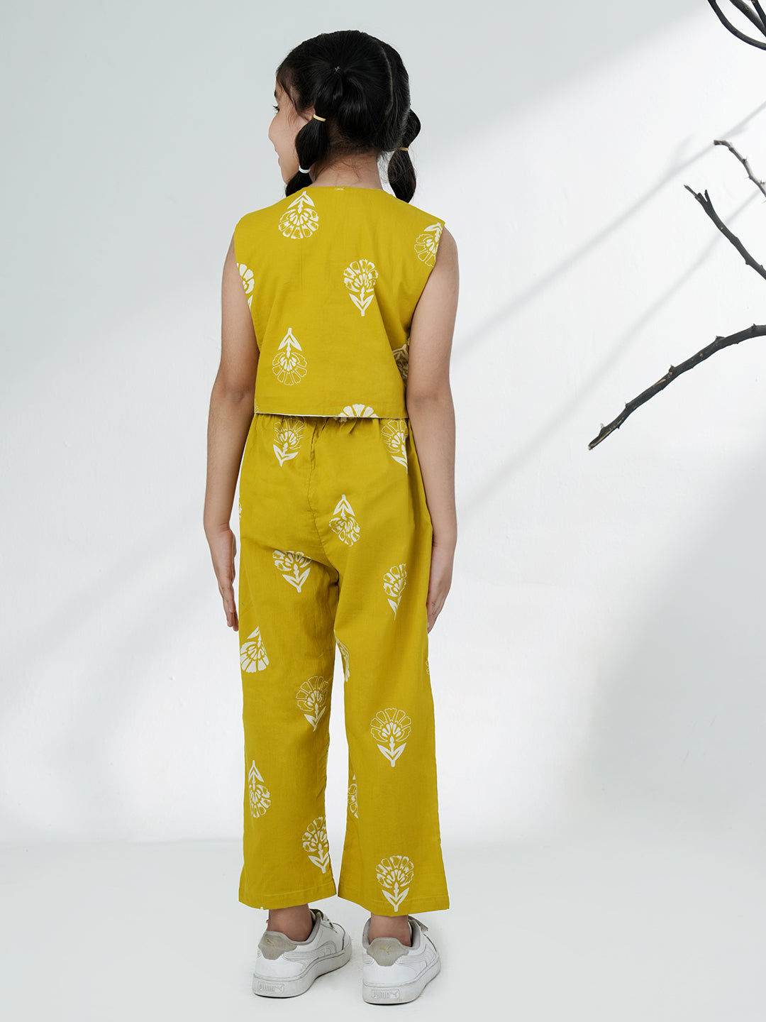AJ Dezines Green Cotton Co-Ord Set for girls features a sleeveless floral crop top with matching pants. Made from breathable cotton, it’s perfect for summer outings, playdates, and casual wear.