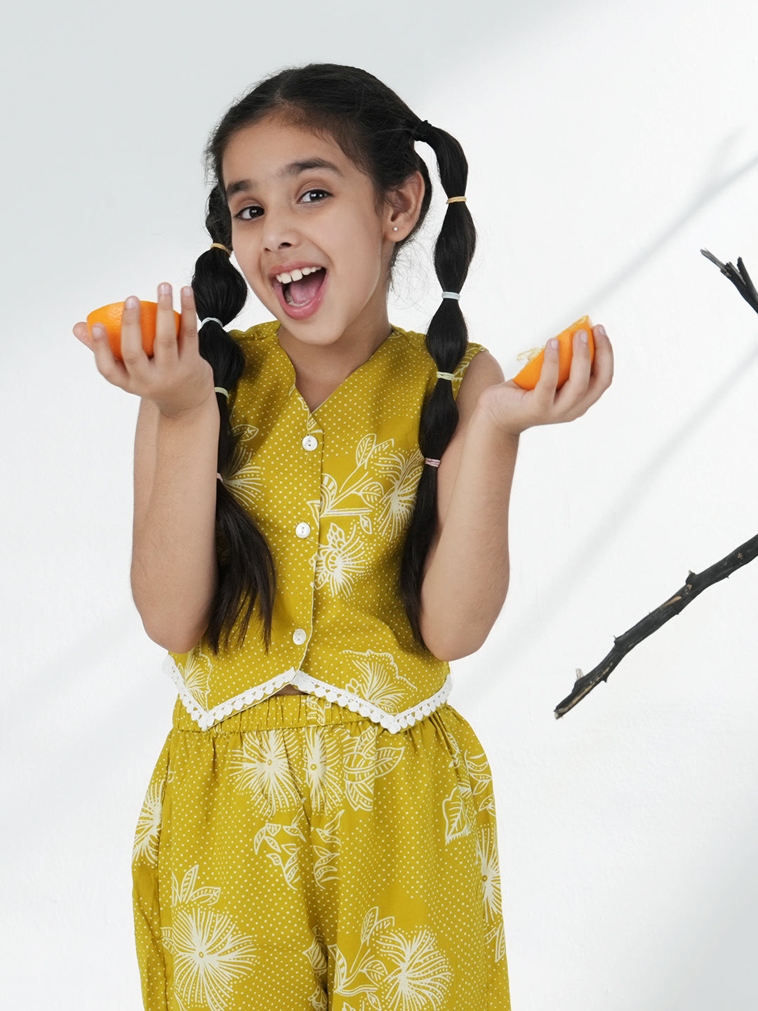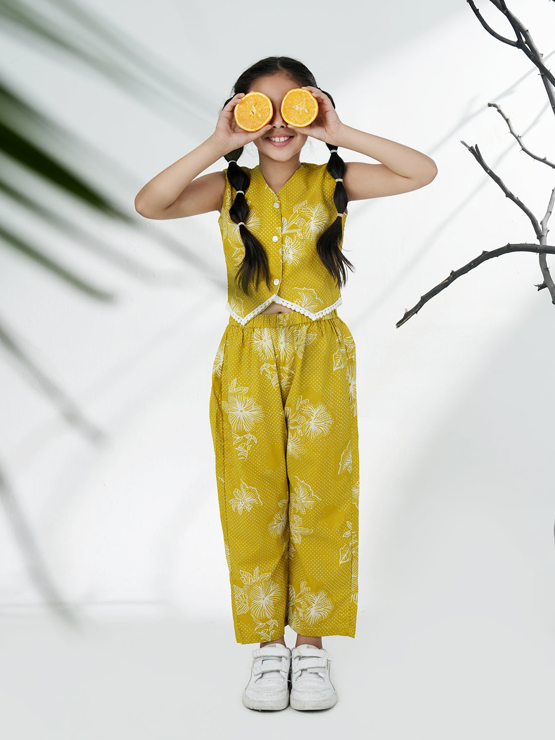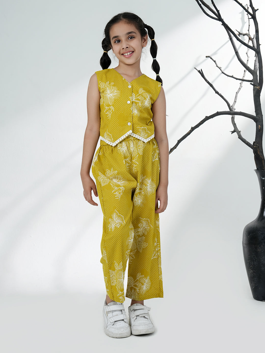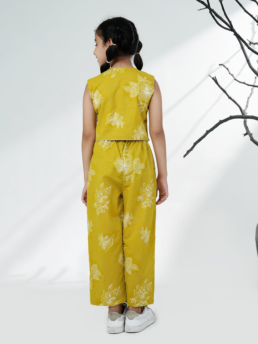 AJ Dezines Green Cotton Co-Ord Set for girls features a sleeveless floral crop top with matching pants. Made from breathable cotton, it’s perfect for summer outings, playdates, and casual wear.