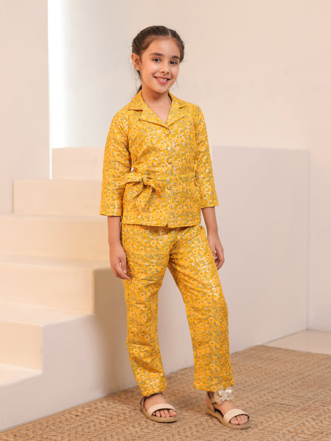AJ Dezines Yellow Brocade 3/4th Sleeves Floral Print Girls Co-Ords