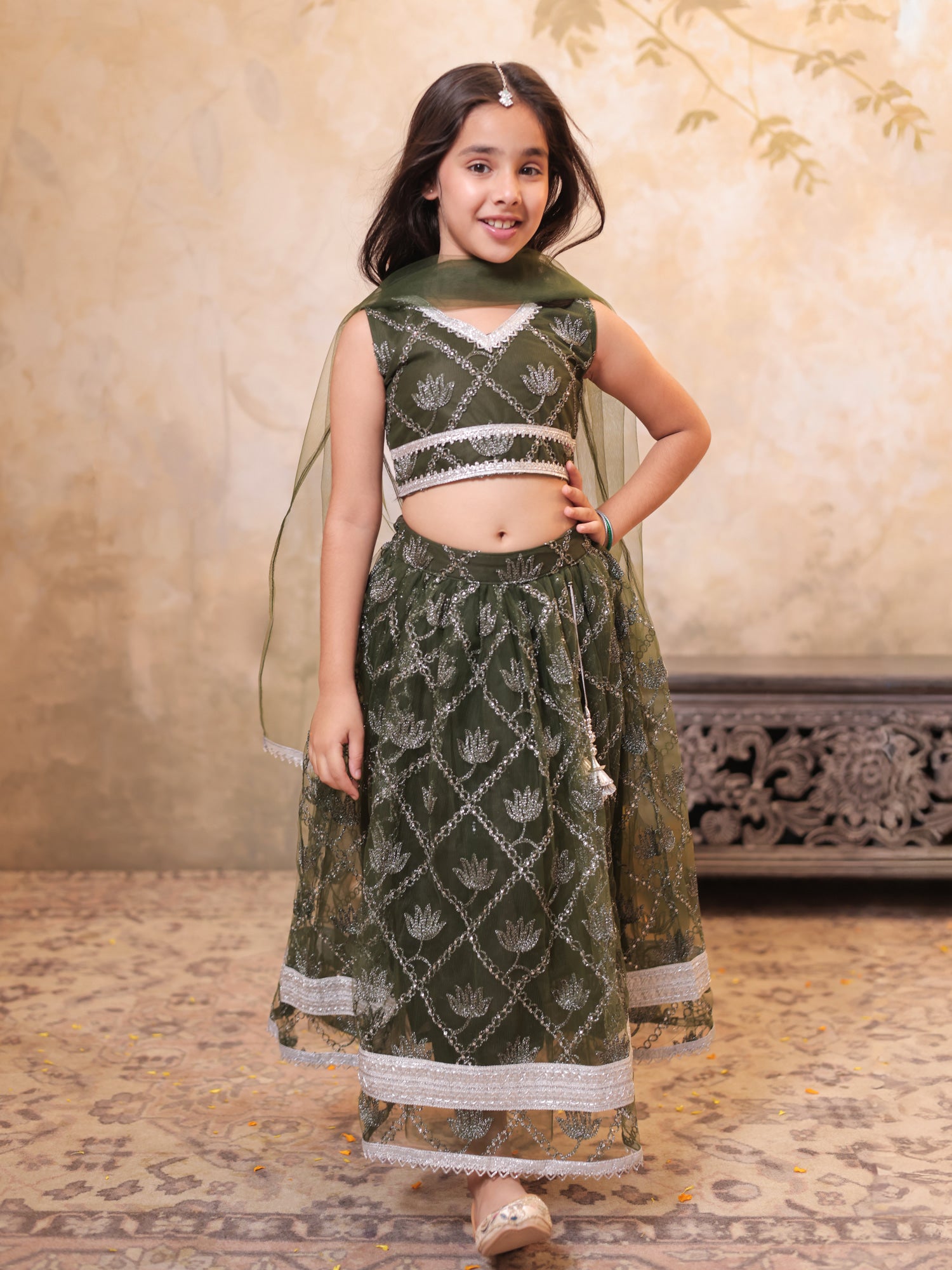 Girls Green Net Sleeveless Heavy Embroidered Lehenga Choli