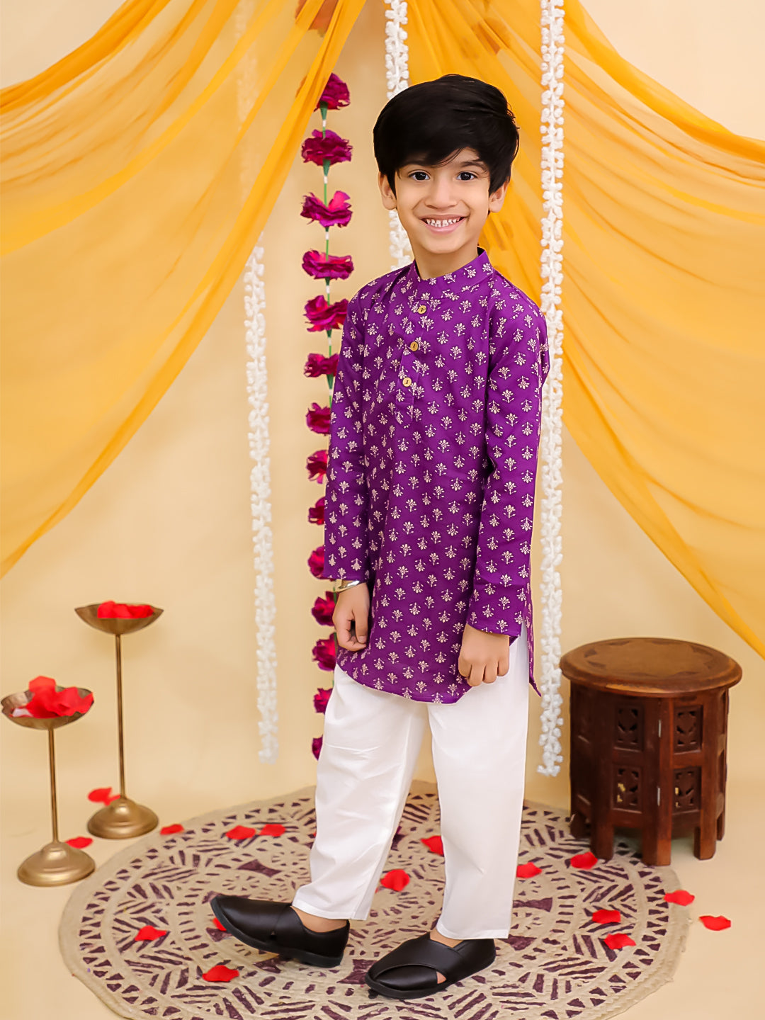 Boys Purple cotton kurta pyjama set for boys with floral print and full sleeves. Soft, stylish, and perfect for festive occasions or family events
